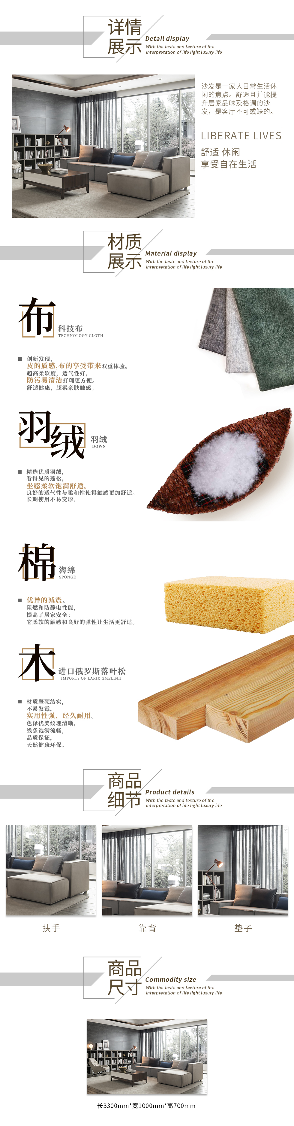 • 现代简约磨砂科技绒布+进口羽绒+俄罗斯落叶松框架+实木脚沙发