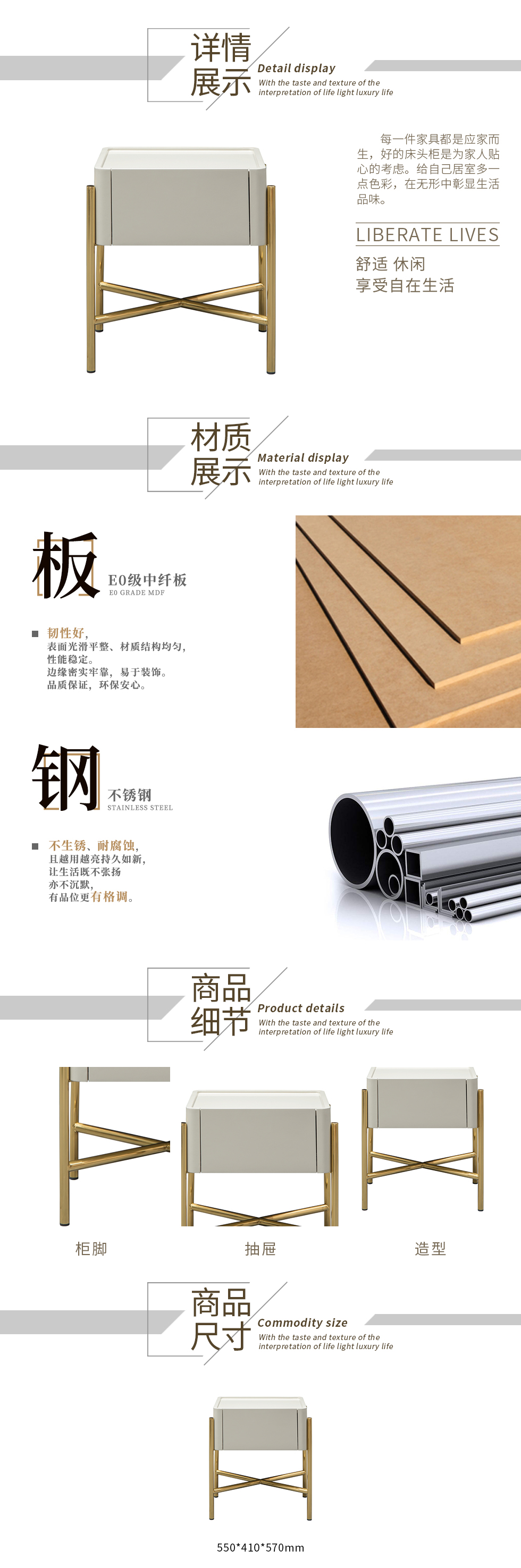 • 现代轻奢E0级中纤板+不锈钢镀金拉丝床头柜